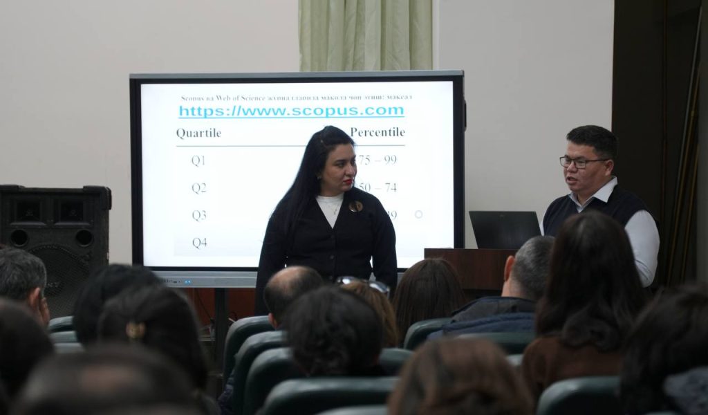 Seminar-treningning asosiy yo‘nalishlari doirasida Scopus va Web of Science xalqaro ilmiy bazalarining ilmiy ekotizimdagi o‘rni, ularning indekslari, baholash mexanizmlari hamda jurnal tanlashda e’tiborga olinadigan muhim mezonlar atroflicha tushuntirildi. Shuningdek, ilmiy maqolalarni xalqaro standartlar asosida tayyorlashda keng qo‘llaniladigan IMRAD strukturasi, tadqiqot muammosini aniqlash, ilmiy bo‘shliqni asoslash hamda metodologik yondashuvning yangiligi va amaliy ahamiyatini ta’minlash masalalariga alohida e’tibor qaratildi.
